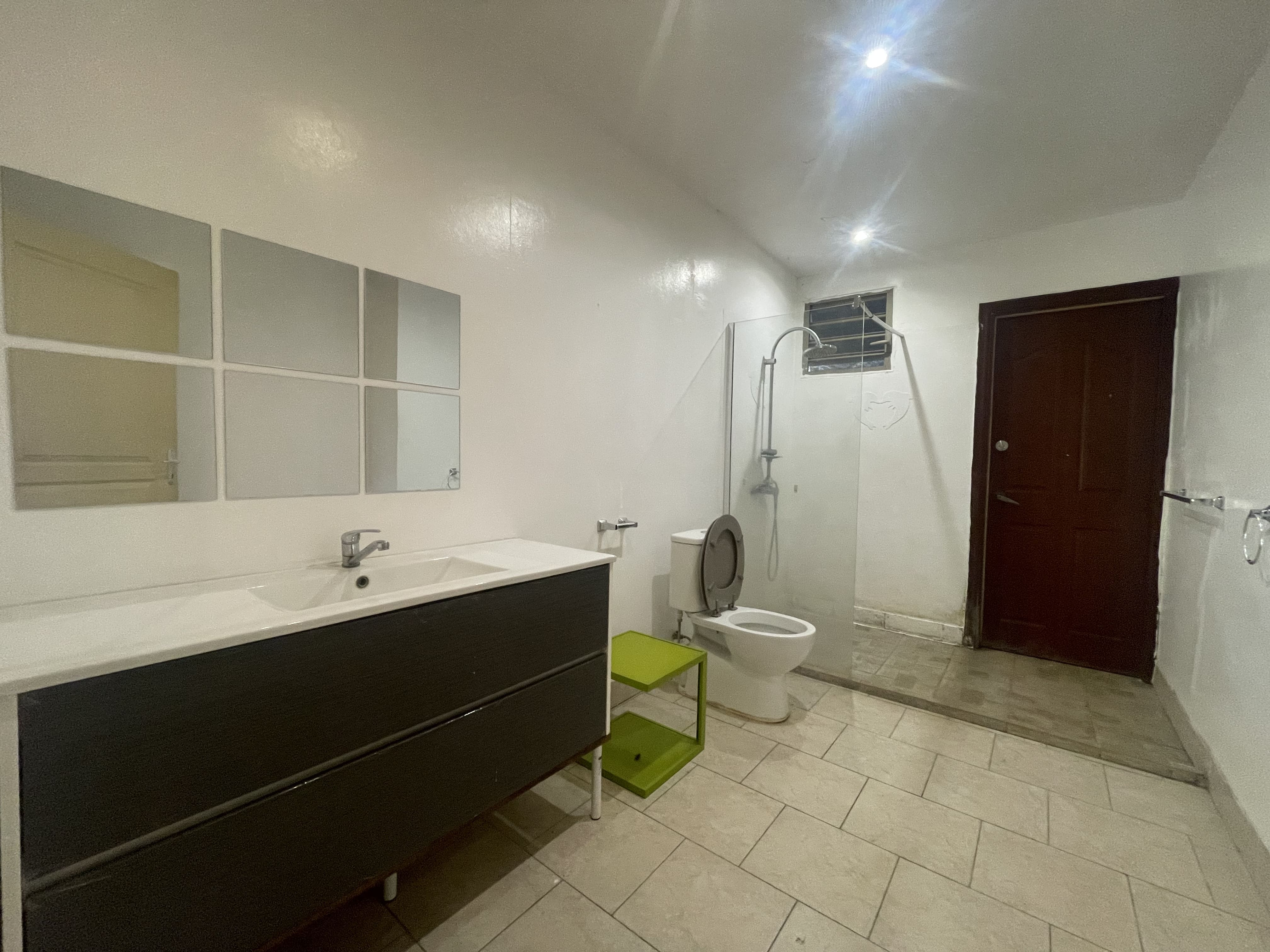 • Salle de bain commune avec douche et WC, disposant également d’un accès extérieur, très pratique au retour de la plage ou de la piscine