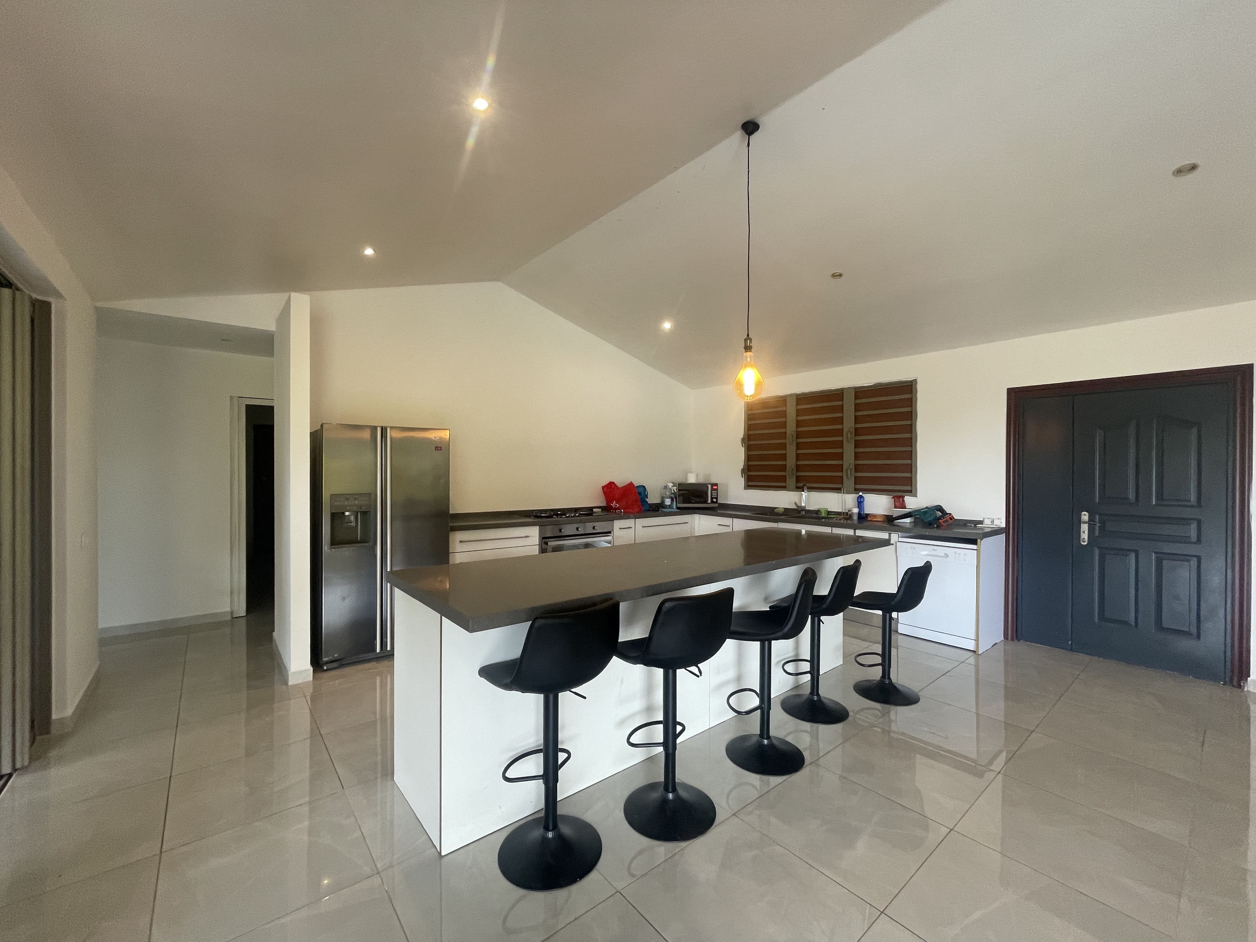 • Cuisine moderne avec grand îlot central, ouverte sur le salon-séjour et un espace bureau